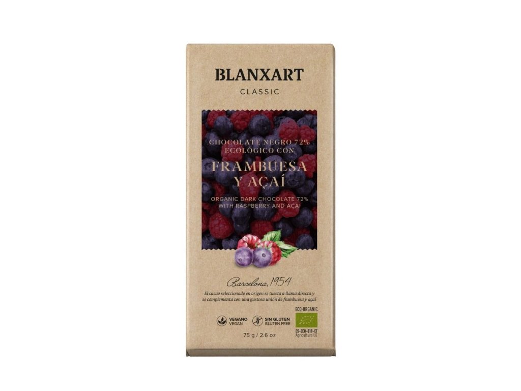Blanxart tmavá 72% tabuľková čokoláda s malinami a acai, 75g