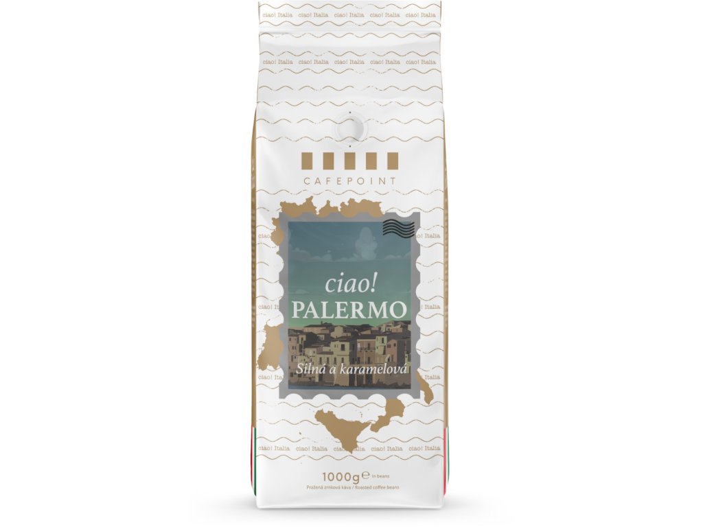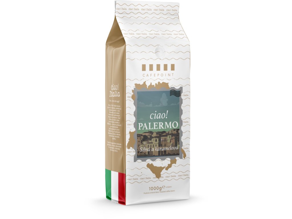 Pražená zrnková káva Cafepoint Ciao Palermo (Čau Palermo) pozostáva z výberových kávových zŕn Arabiky a Robusty pochádzajúcich z plantáží Strednej Ameriky. Vďaka vysokému obsahu Robusty má i viac kofeínu a preto je skôr vhodná na ranné kávičkovanie alebo náročný deň v práci. V šálke sa vyznačuje prenikavou arómou, bohatou krémou a silnou karamelovou chuťou so stredným telom. Táto káva bola namiešaná na základe prieskumu obľúbenosti a preferencií chutí u zákazníkov Cafepointu a je vhodná na prípravu espressa, cappuccina alebo caffé latte.