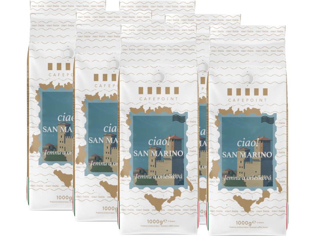 Pražená zrnková káva Cafepoint Ciao San Marino (Čau San Maríno) pozostáva z výberových kávových zŕn Arabiky a Robusty pochádzajúcich z plantáží Strednej Ameriky. V šálke sa vyznačuje jemnou orieškovou arómou, hustou krémou a príjemnou sladkou chuťou so stredným telom a dochuťou po horkej čokoláde. Táto káva bola namiešaná na základe prieskumu obľúbenosti a preferencií chutí u zákazníkov Cafepointu a je vhodná na prípravu espressa, cappuccina alebo caffé latte.