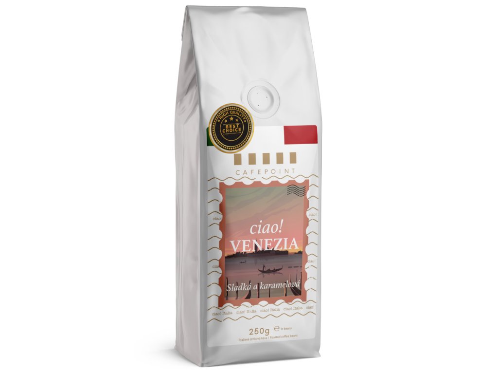Pražená zrnková káva Cafepoint Ciao Venezia (Čau Benátky) pozostáva z vyváženého pomeru výberových kávových zŕn Arabiky a Robusty pochádzajúcich z plantáží Strednej Ameriky. V šálke sa vyznačuje jemnou arómou, konzistentnou, bohatou krémou a sladkou, krémovou chuťou so stredným telom. Táto káva bola namiešaná na základe prieskumu obľúbenosti a preferencií chutí u zákazníkov Cafepointu a je vhodná na prípravu espressa, cappuccina alebo caffé latte.