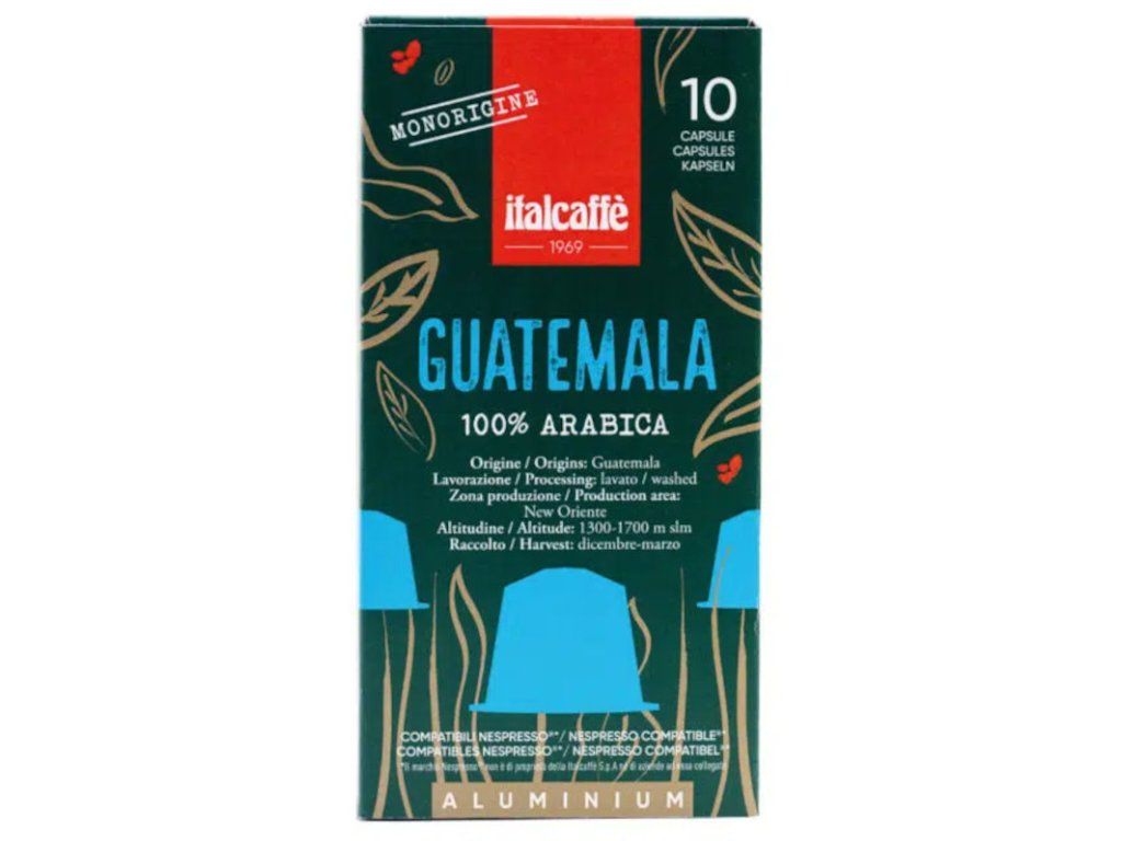 Pražená mletá káva Italcaffé Single Origin Guatemala určená pre systém Nespresso je odrodová 100% Arabika pochádzajúca z Guatemaly, ktorá patrí medzi krajiny s obrovským výberom najvýraznejších a najlepších svetových káv. Môžete v nej cítiť kvetinovú aciditu, ktorá je často korenistá alebo čokoládová. Aróma nesie tóny čerstvého ovocia (broskýň a fíg) a kvetov. Má stredné telo a v dochuti sa dajú rozpoznať náznaky kakaa a mandlí. Káva je ihneď po zomletí vákuovo uzatvorená do hliníkovej kapsule vďaka čomu sa stáva recyklovateľnou a zároveň si káva zachováva svoju chuť, arómu a kvalitu až do momentu použitia.