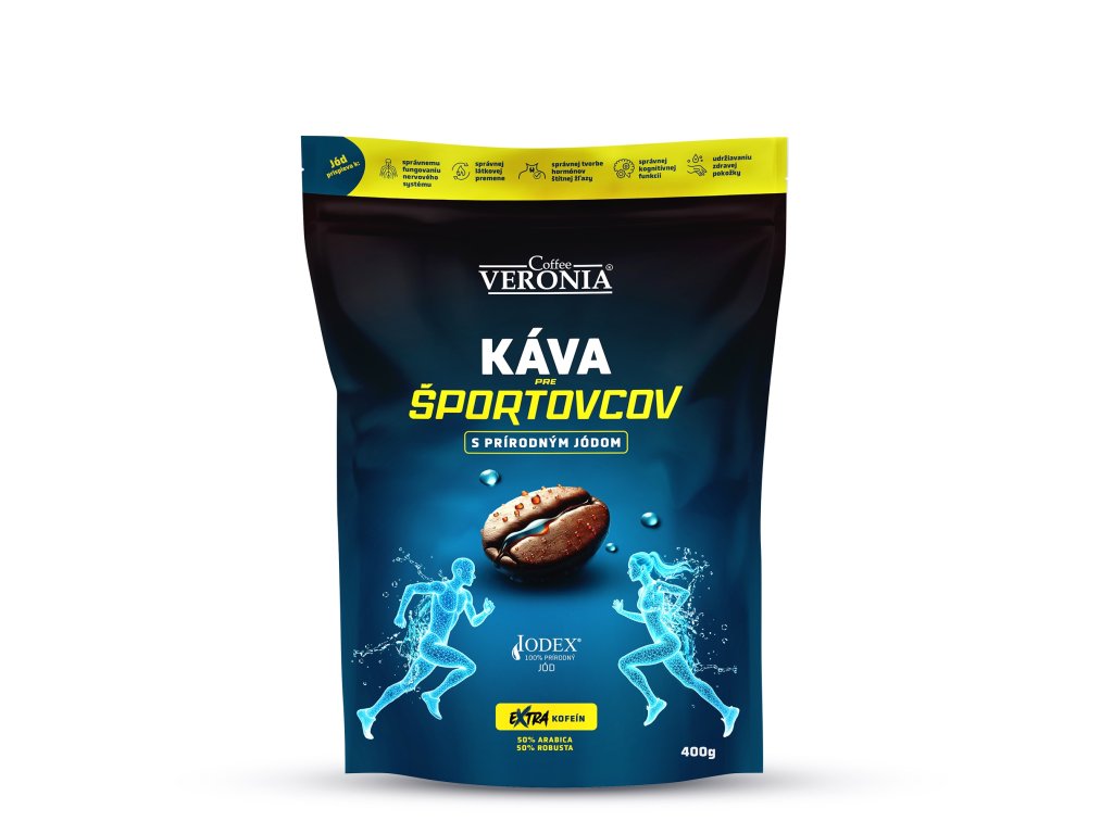 Coffee VERONIA pre športovcov je unikátna kombinácia kávy s extra kofeínom obohatená o prírodný jódový koncentrát s minerálmi. V šálke kávy je obsiahnuté 30µg jódu, čo predstavuje 20% doporučenej dennej dávky.