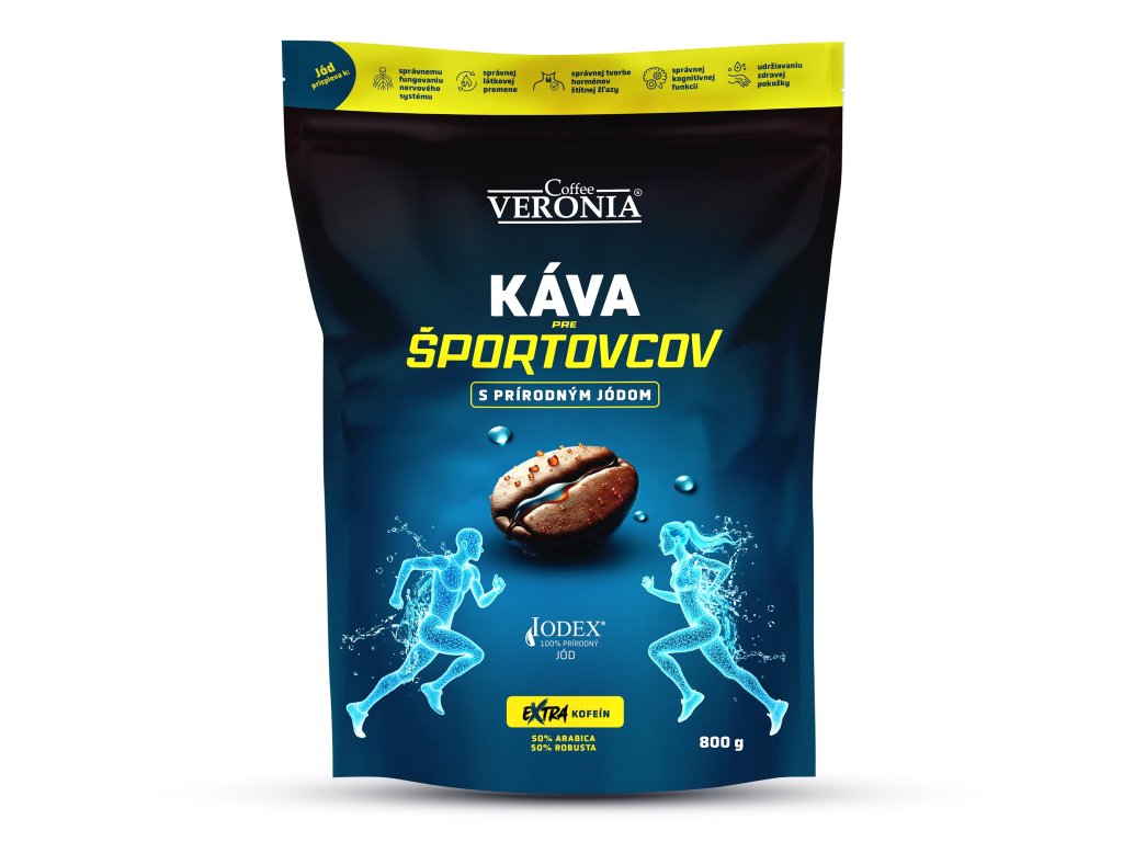 Coffee VERONIA pre športovcov je unikátna kombinácia kávy s extra kofeínom obohatená o prírodný jódový koncentrát s minerálmi. V šálke kávy je obsiahnuté 30µg jódu, čo predstavuje 20% doporučenej dennej dávky.