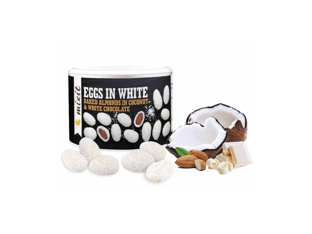Anjelsky biele, nebesky dobré! Vychutnajte si pražené mandle v bielej čokoláde posypané strúhaným kokosom. Chuťový zážitok opäť bez palmového oleja a umelých aróm.