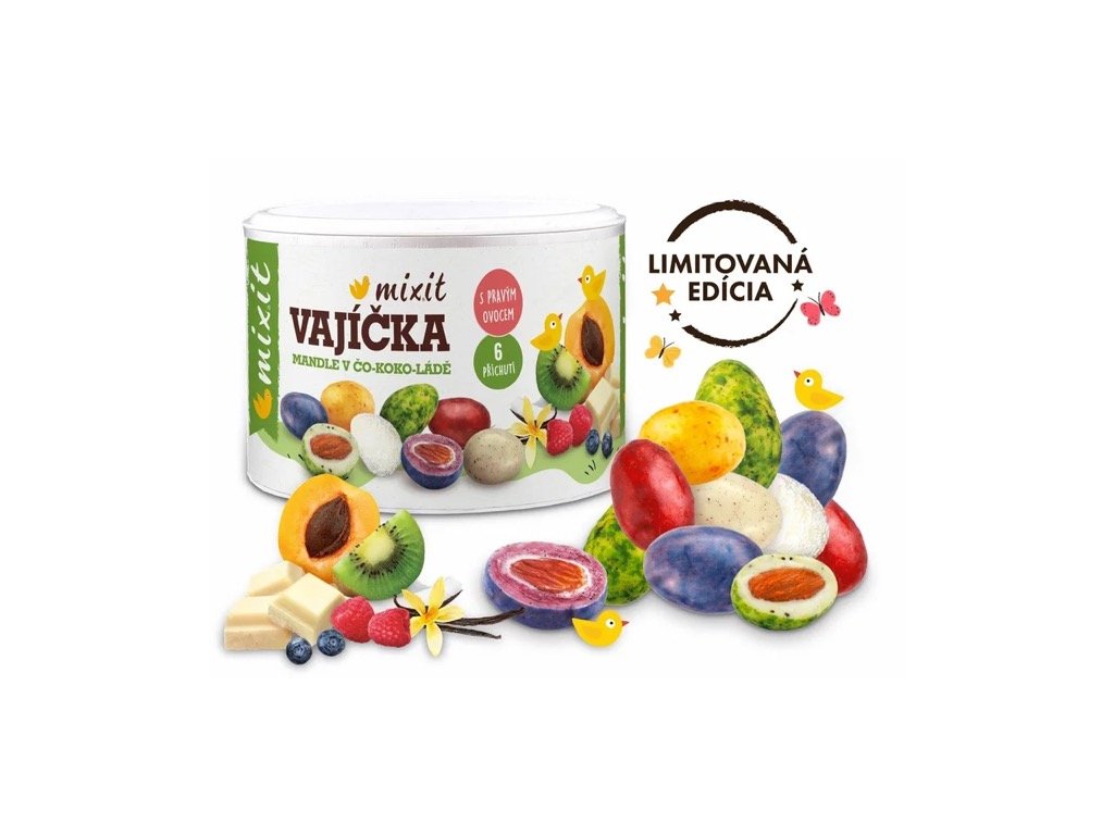 Veselá Veľ-koko-nočná limitovaná edícia Mixit vajíčok v novom kabátiku! Mixit sliepočky opäť zniesli tie najlahodnejšie čokoládové vajíčka. Vo vnútri každého vajíčka nájdete chrumkavú mandľu obalenú v bielej čokoláde, ochutenú nie len lyofilizovaným ovocím a, ako už je u MIXIT zvykom, sú bez umelých farbív a palmového oleja. Veľká noc je pripravená na šibačov a kúpačov!