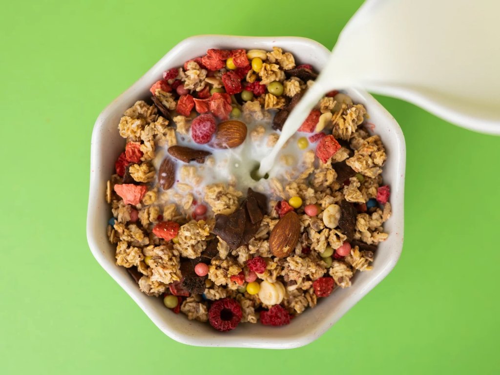granola 71 % (celozrnné ovsené vločky, vláknina z koreňa čakanky, slnečnicové semená, ľanové semená, repkový olej), kokosové plátky s kakaom 5 % (kokosové plátky pražené 67,8 %, trstinový cukor, kakaový prášok 7,5 %, morská soľ), mandle pražené 4,7 %, zmes farebných chrumiek v bielej čokoláde 11,6 % [biela čokoláda 69 % (cukor, kakaové maslo, sušené mlieko, sušená smotana, emulgátor: lecitíny; prírodná vanilková aróma), crispies (pšeničná múka, cukor, jedlá soľ, kakao so zníženým obsahom tuku), prášok z mrazom sušených malín, mleté listy zeleného čaju, koncentrát spiruliny a požltu farbiarskeho, leštiaca zmes (leštiaca látka: arabská guma; cukor, med)], kukuričné lupirnky v bielej čokoláde 3,4 % [biela čokoláda 56 % (cukor, kakaové maslo, sušené plnotučné mlieko, sušená smotana, emulgátor: lecitíny; prírodná vanilková aróma), kukuričné lupienky 42 % (kukuričná krupica, cukor, jedlá soľ, jačmenný sladový výťažok, minerálna látka: uhličitan vápenatý), leštiaca zmes (leštiaca látka: arabská guma; cukor, med)], lyofilizované jahody 2,1 %, lyofilizované maliny 1,7 %. Môže obsahovať stopy škrupinových plodov, arašidov, sezamu a sóje.