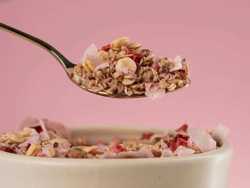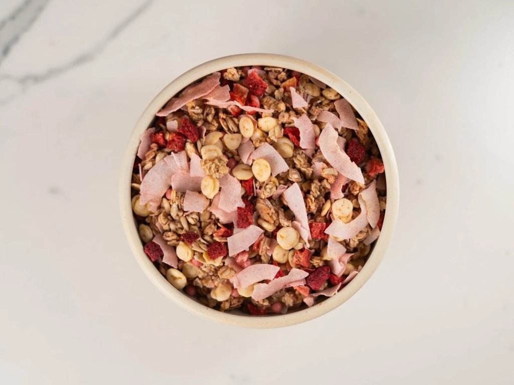 Granola 62 % (celozrnné ovsené vločky, vláknina z koreňa čakanky, slnečnicové semená, ľanové semená, repkový olej), kukuričné lupienky v bielej čokoláde 14 % [biela čokoláda 56 % (cukor, kakaové maslo, sušené plnotučné mlieko, sušená smotana, emulgátor: lecitíny; prírodná vanilková aróma), kukuričné lupienky 42 % (kukuričná krupica, cukor, jedlá soľ, jačmenný sladový výťažok, minerálna látka: uhličitan vápenatý), leštiaca zmes (leštiaca látka: arabská guma; cukor, med)], kokosové plátky 12 %, pšeničné crispies v bielej čokoláde s malinami 7 % [biela čokoláda 69 % (cukor, kakaové maslo, sušené mlieko, sušená smotana, emulgátor: lecitíny; prírodná vanilková aróma), crispies (pšeničná múka, cukor, jedlá soľ, kakao so zníženým obsahom tuku), prášok z mrazom sušených malín 2 %, leštiaca zmes (leštiaca látka: arabská guma; cukor, med)], lyofilizované jahody 3 %, prášok z lyofilizovaných jahôd 1 %, lyofilizované maliny 1 %. Môže obsahovať stopy škrupinových plodov, arašidov, sezamu a sóje.