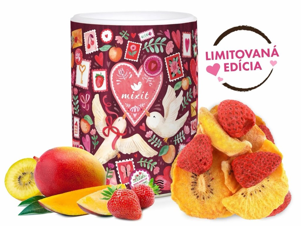 Na veľkosti záleží a na Valentína to platí dvojnásobne. Vo valentínskom mixe na vás čakajú poriadne veľké kúsky ovocia, ktoré vďaka lyofilizácii nestratili svoju chuť, tvar ani vitamíny. V hlavnej úlohe mango, exotická láska, ktorá vám na nervy nepôjde. Žlté kiwi nabité vitamínmi a kyslasté len mierne, čo sa nedá povedať o rande, na ktoré ste už radšej dávno zabudli. A nakoniec celé jahody, pretože v tomto mixe na kompromisy nehráme.