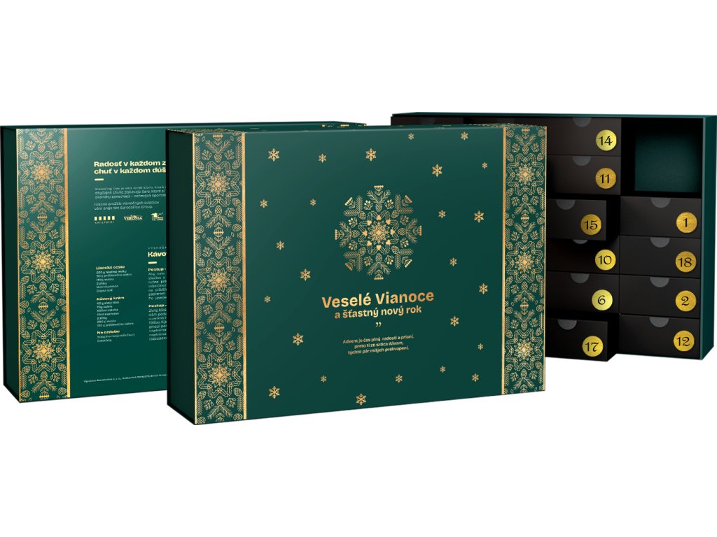 Vychutnajte si čaro Vianoc deň po dni. Náš adventný kalendár je naplnený tým najlepším, čo spríjemní predsviatočné chvíle – voňavou zrnkovou kávou, vďaka čomu môžete celý advent ochutnávať každý deň kávu z iného kúta sveta.
