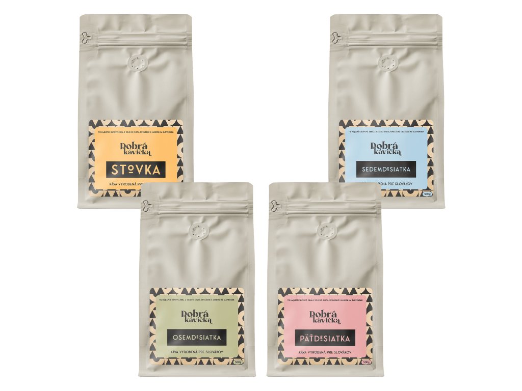 Dobrá Kávička je spojením prvotriednej suroviny, skúseností majstra pražiara a našej lásky ku káve. Kombináciou týchto faktorov vznikla unikátna rada 4 vyladených kávových zmesí, ktorých názvy sú inšpirované percentuálnym zastúpením Arabiky v každej z nich. Základom týchto káv sú zelené kávovníkové zrná 100%-ných Arabík pochádzajúcich z Peru, Mexika, Indie, Kolumbie, Hondurasu, Brazílie a Nikaraguy. Ich výsledná chuť je príjemne čokoládová s tónmi horkého kakaa a ľahkou aciditou v závere. Pre milovníkov zmesí Arabiky a Robusty sme do vybalansovaného základu pridali indickú Robustu, ktorá sa vyznačuje bohatou krémou a intenzívnou horkastou arómou. Dobrá kávička je stredne pražená na Slovensku podľa overených postupov tak, aby boli zachované charakteristické chute jednotlivých druhov káv. Zmesi sa hodia na prípravu klasického talianskeho espressa, avšak ich plná a vyvážená chuť veľmi dobre vynikne aj v kombinácii s mliekom v nápojoch ako cappuccino, caffé latte alebo flat white.